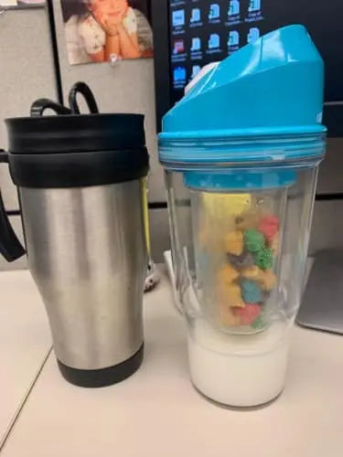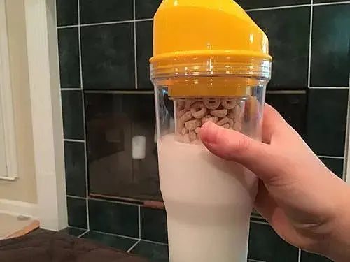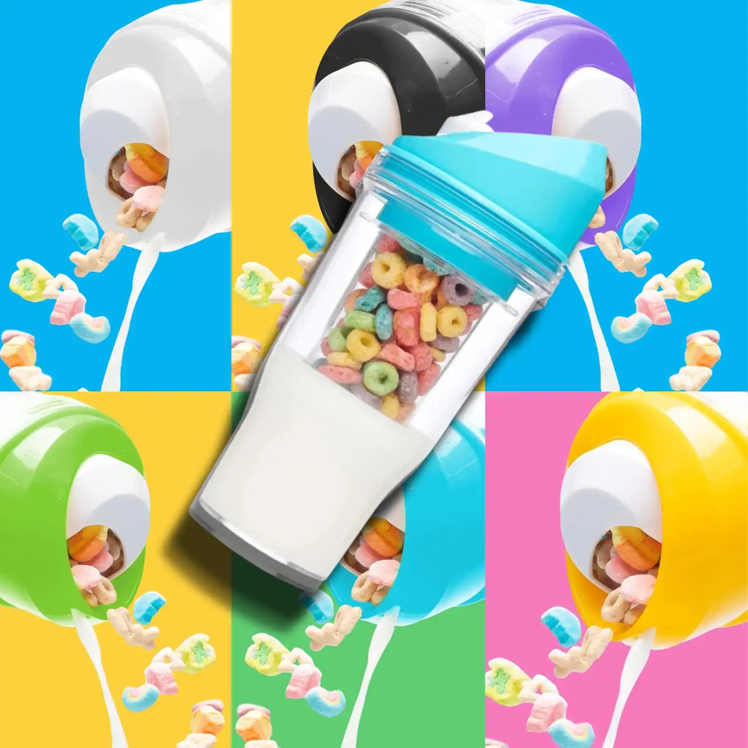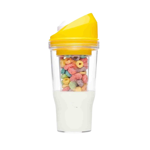 - El cereal y la leche se guardan en compartimentos separados y solo se mezclan en tu boca al beber.
