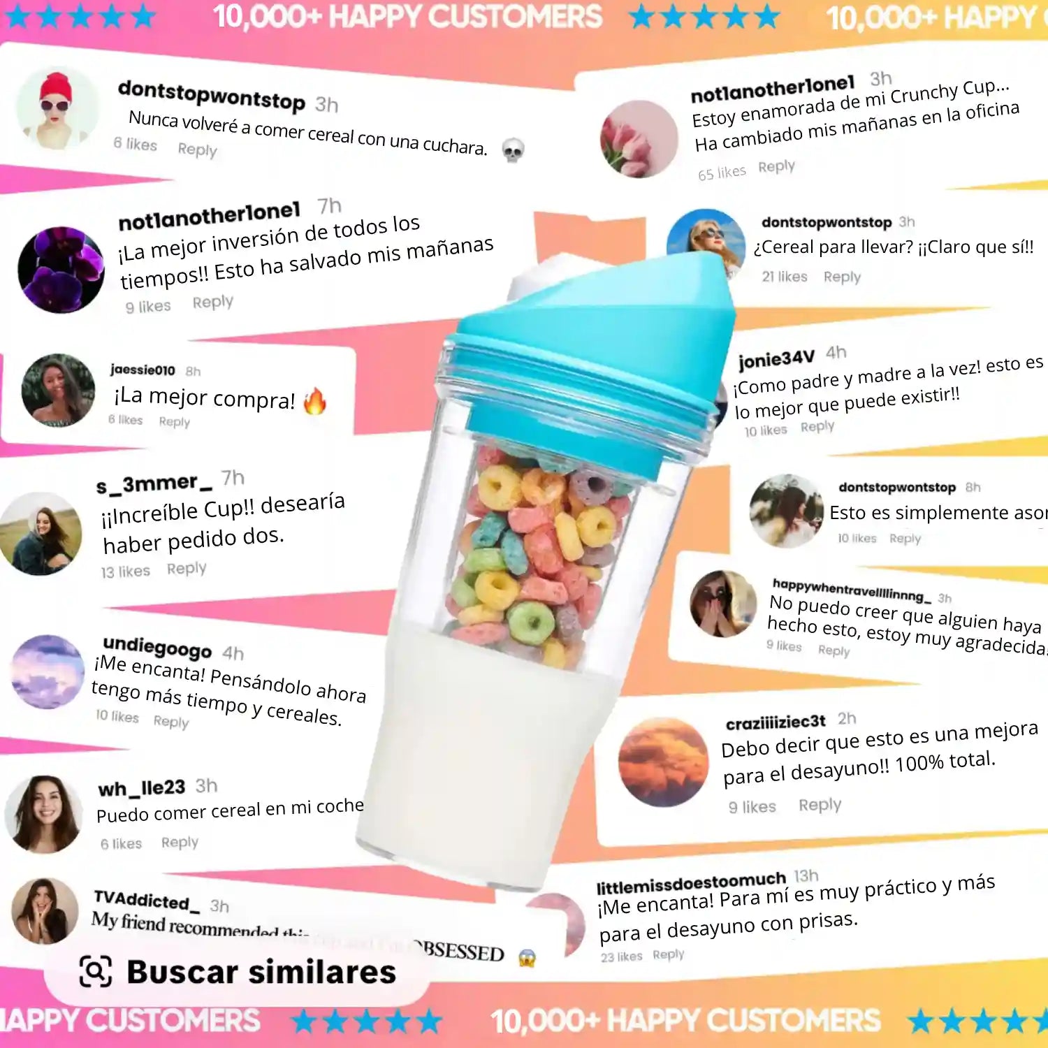 “Con Crunchy Cup® tu desayuno es más fácil, limpio y divertido. ¡Y si no te encanta, tienes 30 días de garantía para devolverlo!